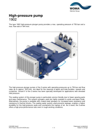 The ultra high pressure pumps of the 02-series with operating pressures up to 750 bar and flow rates up to approx. 224 l/min, are ideal for the cleaning of pipes and tube bundles, vessels and containers. The seal system of this plunger pump is very easy to maintain due to fewer wearing parts. The ceramic plungers used are highly resistant to acid and alkaline liquids. An alternative available is the pump with coated steel plungers, which enhances wearing resistance and resistance to temperature shocks. The 2-series impresses with a good price/performance ratio due to long service lives – even in rough everyday work. A special feature of the 02-series is a second shaft end which allows another pump to be connected and can double the performance if required. All gearboxes of WOMA pumps have an integral oil cooling system. The availability of an ATEX version can be checked on request.